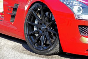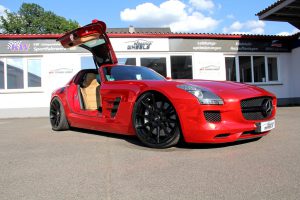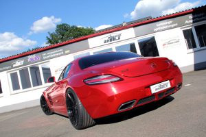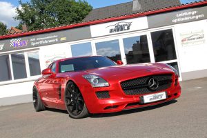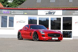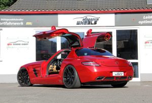 Bei RFK Tuning aus dem in der Nähe von Kaiserslautern gelegenen Waldfischbach-Burgalben setzte man jetzt noch einen drauf: Die Spezialisten verfeinerten den AMG-Sportler durch gezielte optische sowie technische Modifikationen. Mittels einer Komplettfolierung in spiegelndem Chrom-Rot verwandelt RFK den SLS endgültig in einen Hingucker allererster Güte. Kontrastierend zu dieser Farbgebung wurden alle Chromteile der Karosserie, wie etwa der Tankdeckel oder die Mercedes-Sterne und Schriftzüge in glänzendem Schwarz foliert. Perfekt dazu passen die schwarzen E1-Einteiler des hauseigenen Felgenlabels Elegance Wheels. Die Zehn-Speichen-Räder kommen in den Formaten 9,5×20 Zoll an der Vorder- sowie 10,5×20 Zoll an der Hinterachse zum Einsatz und sind dabei mit Pneus in den Abmessungen 265/30R20 sowie 295/30R20 bezogen.