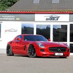 Damit der SLS AMG sowohl in optischer als auch in fahrdynamischer Sicht noch besser auf der Straße liegt, installierten die RFK-Mannen ein KW Variante 3-Gewindefahrwerk mit justierbarer Druck- und Zugstufendämpfung. Letztlich haben sie die Leistungsdaten des SLS natürlich auch beachtet: Der Motor kam in den Genuss einer Leistungssteigerung von serienmäßig 571 auf nunmehr 605 PS. Diese wirkt sich auch positiv auf das maximale Drehmoment und die Höchstgeschwindigkeit des Flügeltürers aus: Ersteres erhöht sich von 650 auf 675 Nm, während letztere nun rasante 335 km/h beträgt.