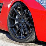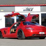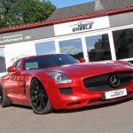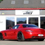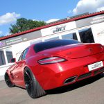 Insbesondere die Komplettfolierung in spiegelndem Chrom-Rot macht aus dem SLS einen Hingucker erster Klasse. Im Kontrast zur Karosserie wurden alle Chromteile – etwa Tankdeckel, Mercedes-Sterne und Schriftzüge – mit glänzend schwarzer Folie bezogen. Optisch perfekt dazu passen die schwarzen E1-Einteiler des hauseigenen Felgenlabels Elegance Wheels. Die Zehn-Speichen-Räder kommen in den Dimensionen 9,5×20 Zoll an der Vorder- sowie 10,5×20 Zoll an der Hinterachse zum Einsatz und sind dabei mit Pneus in den Abmessungen 265/30R20 sowie 295/30R20 bezogen.